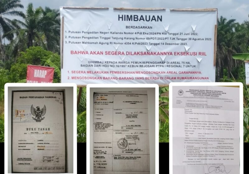 Lampung Selatan – Puluhan rumah warga di Desa Natar, Kecamatan Natar, Kabupaten Lampung Selatan, rata dengan tanah setelah dihancurkan oleh PTPN 1 Regional 7. Tindakan tersebut dilakukan dengan dalih melaksanakan penetapan eksekusi dari Pengadilan Negeri Kalianda tertanggal 31 Desember 2024.