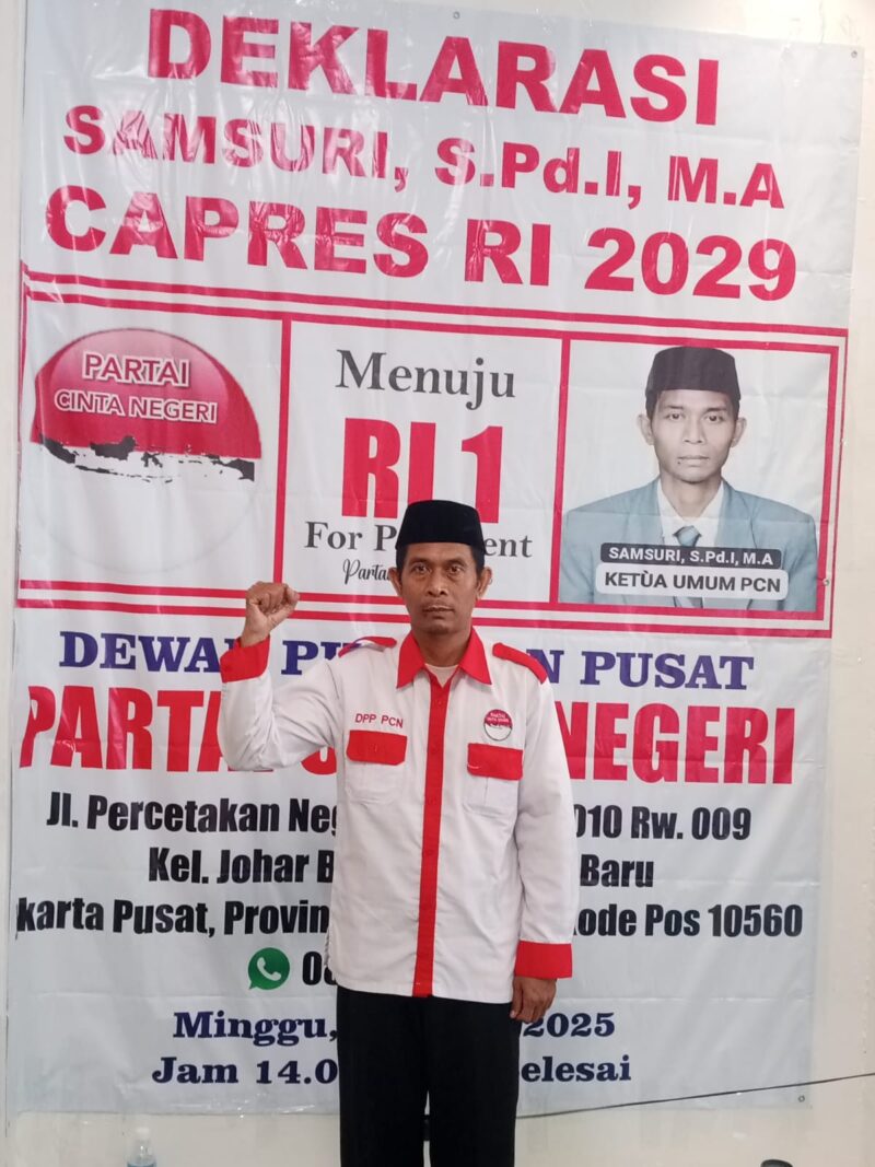Jakarta | Sosok pendiri sekaligus Ketua Umum Partai Cinta Negeri, Samsuri, S.Pd.I, M.A, dideklarasikan sebagai Calon Presiden Republik Indonesia untuk Pemilihan Presiden (Pilpres) 2029 oleh Dewan Pimpinan Pusat Partai Cinta Negeri (DPP PCN). Deklarasi tersebut dibacakan oleh Ketua Bidang Litbang DPP Partai Cinta Negeri, Bapak Suwarno, pada hari Minggu, 27 April 2025, pukul 14.00 WIB hingga selesai.